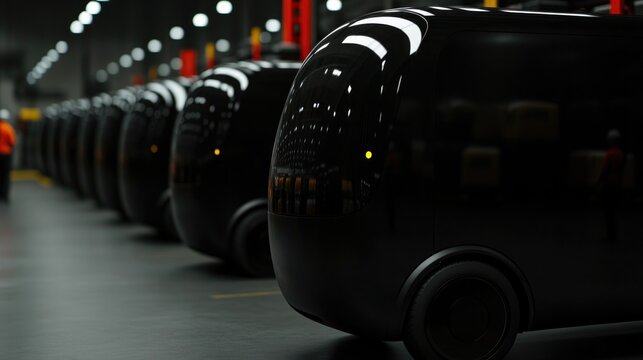 Sleek black autonomous vehicles lined up in futuristic indoor se