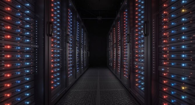data center server room with glowing blue and red lights in a long corridor, technology infrastructure concept.
