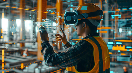 Engineer male worker using VR visual reality technology in construction industry with overly graphic