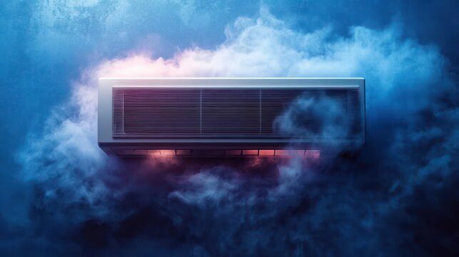 wall-mounted air conditioning unit hovering in swirling blue mist with warm pink underglow, sleek modern vent conveying a cool, futuristic and mysterious mood