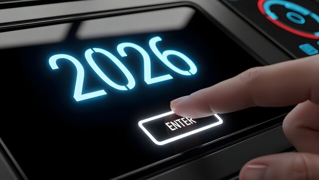 Hand Pressing Enter Button on Futuristic Digital Screen Displaying Year 2026