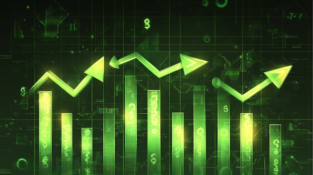 A glowing futuristic graph with arrows pointing upward surrounded by currency symbols