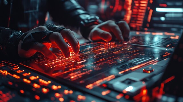 Cyberpunk hacker manipulating futuristic console, red-lit lab, data streams
