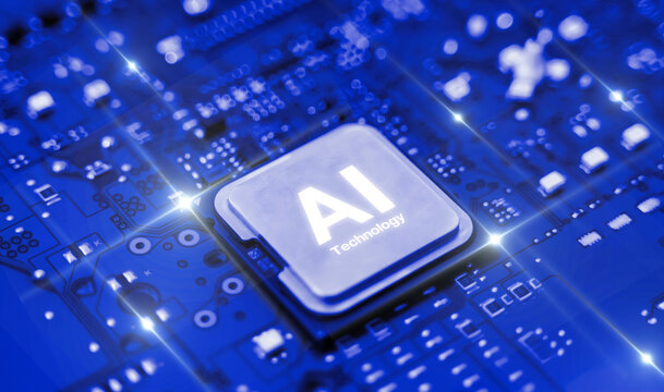 AI microchip installed on glowing blue motherboard, representing artificial intelligence technology and futuristic computing.