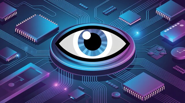 Abstract digital circuit board with glowing pink and teal components connected by illuminated pathways