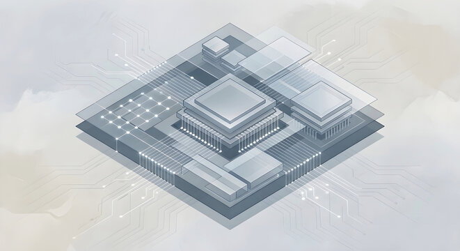 Abstract AI circuit board background. Technology connected white lines with electronics elements on tech bg. Computer motherboard with chip, and semiconductor. Elegant gray digital vector illustration