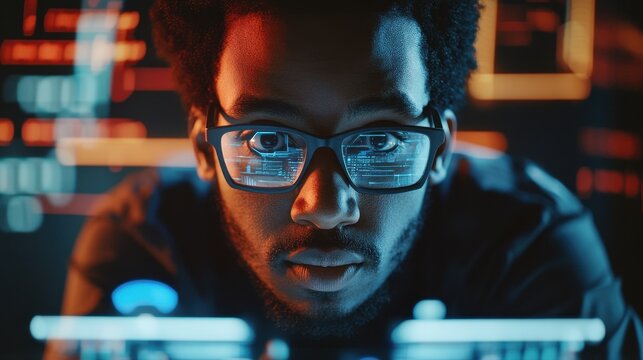 A Black African American IT specialist looking at a digital interface with AI cybersecurity
