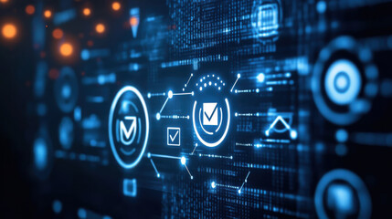 A futuristic interface with a shield icon and various security symbols