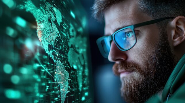 Global surveillance monitor displays real-time world data, including potential threat locations and critical metrics.  Modern, high-tech interface