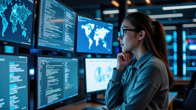 Focused individual analyzes data on multiple screens in modern tech environment, showcasing advanced technology and programming
