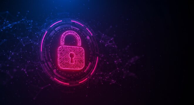 Futuristic cybersecurity concept with glowing microchip and padlock