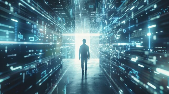 A man is seen walking through a tunnel with walls composed of digital data streams and codes. The tunnel is illuminated with a glow, highlighting the mans movement through the data-filled space