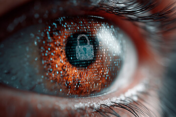 Close up of human eye shows security padlock and binary code. Cyber protection data concept. Biometric scanning illustration about digital identity, access and privacy