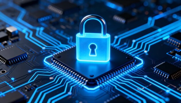 Glowing digital padlock circuit board, neon cybersecurity and data protection concept with futuristic bokeh lighting and secure network atmosphere