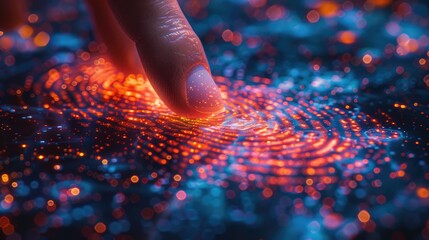 Finger touching glowing digital fingerprint scanner, Biometric security with digital interface, Futuristic identity verification technology