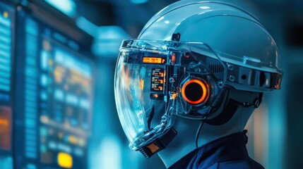 Engineer wearing a futuristic helmet with a transparent visor and head up display monitors a digital screen with complex data in a high tech control room