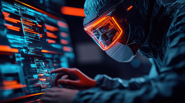 futuristic hacker wearing high tech visor and mask interacts with glowing screens filled with data. scene conveys sense of advanced technology and cybersecurity