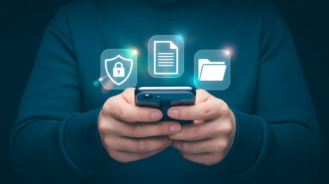 Smartphone with floating icons for data protection, digital file management, and mobile cybersecurity concepts