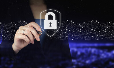 Data protection from hacker.GDPR. Hand holding digital graphic pen and drawing digital hologram lock, padlock sign on city dark blurred background. Protection business network and digital data.