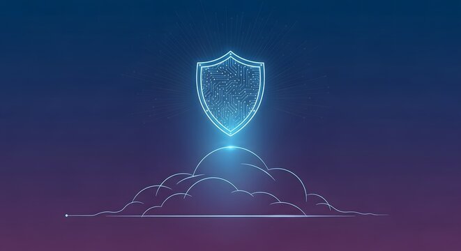 Futuristic digital shield symbolizing cybersecurity in neon glow