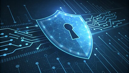 Futuristic Digital Shield with Lock Symbol in a Blue and Red Technological Background Design