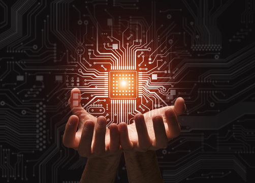Futuristic pyramid hologram over circuit board, depicting advanced technology.