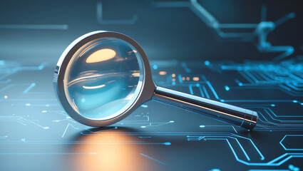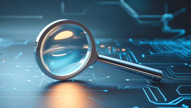 Magnifying glass over a circuit board represents data analysis and technological investigation
