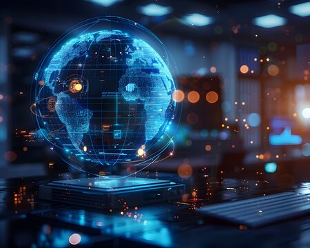 Futuristic Holographic Interface Displaying 3D Rotating Earth with Weather Data and Global Statistics