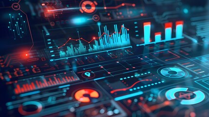 Displaying futuristic analytics dashboard with interactive pie, radar hud, bar and line graphs