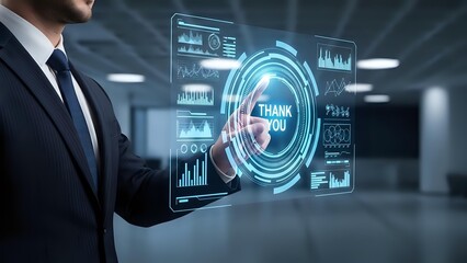 Professional businessman interacting with futuristic holographic interface displaying data analytics and thank you message in modern office environment.
