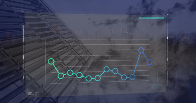 Image of statistical data processing over clouds in the sky against tall buildings