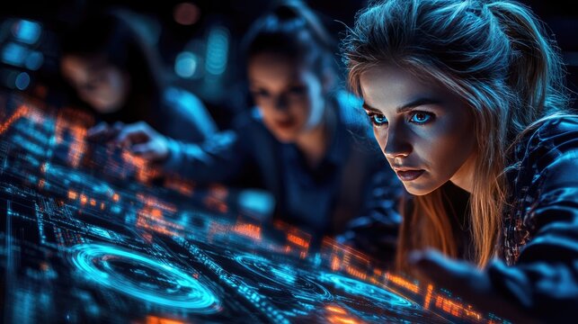 Focused women analyzing complex data on a futuristic interface with blue lights