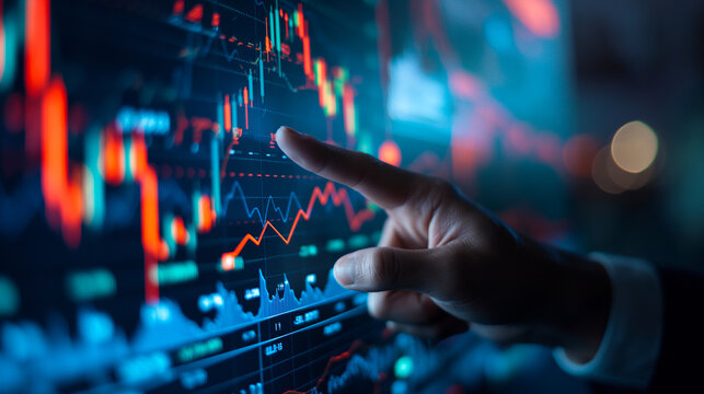 Analyzing Financial Data on Digital Display. Close-up of a hand pointing at financial graphs on a high-tech digital screen, indicative of market analysis and investment strategies.