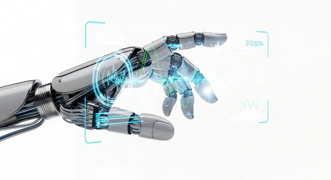 Robotic hand interacting with digital interface on a white background, displaying waveform and data visuals; concept for future technology, artificial intelligence and robotic engineering