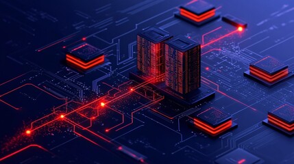 Data processing action in a high-tech server room digital environment futuristic viewpoint