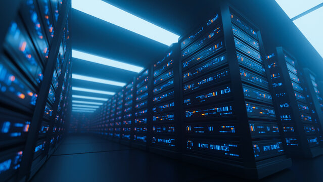 Big data center server racks hardware data network host room storage systems technology. 3d rendering.