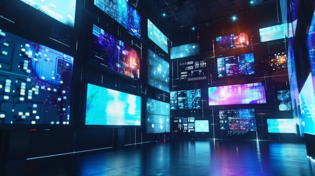 Futuristic Control Room with Multiple Screens Displaying Data and Information