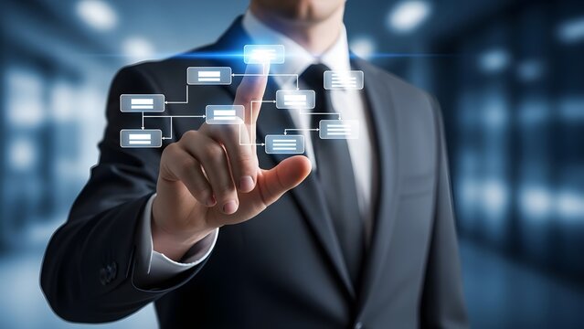 Businessman Interacting with Futuristic Digital Flowchart Interface.