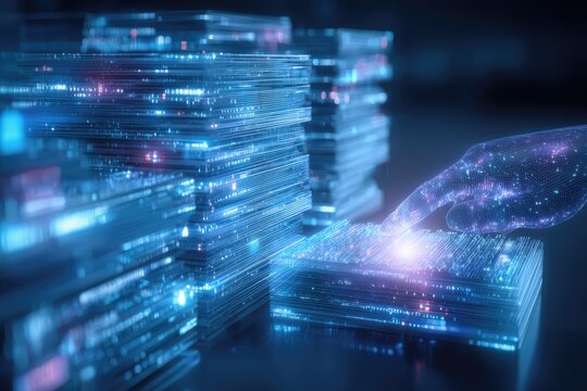 Person interacts with glowing digital interface displaying complex network data. Hand points to bright center of circular graphics on screen. Futuristic tech concept.