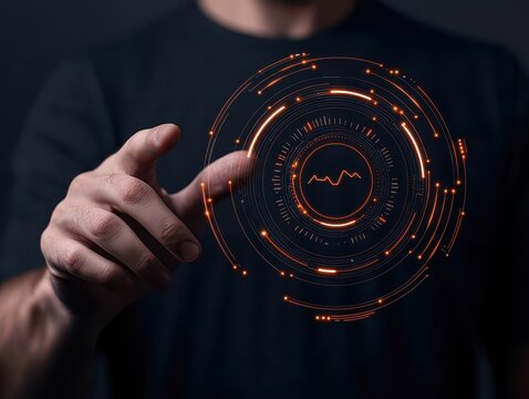 A person interacts with a glowing digital interface displaying circular data and graphical elements in a dark environment.