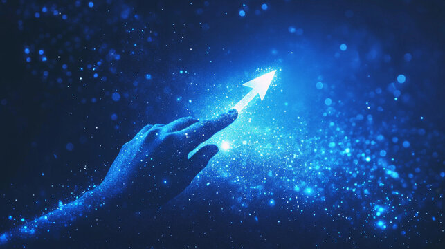 Human arm or hand or palm is touching arrow up concept digital image . Low poly blue. Polygonal abstract business  illustration. Digital vector illustration as a starry sky or Cosmos. Vector  in RGB