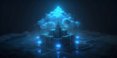 A futuristic digital city built on a circuit board, topped with glowing blue clouds.