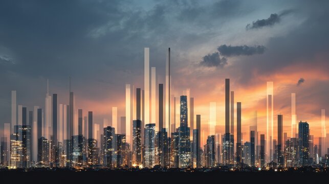 cityscape with modern skyscrapers and overlaid financial graphs, symbolizing the bustling economy and the stock market.