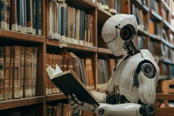 Humanoid robot engrossed in reading a book with complex equations at a library, showcasing advanced artificial intelligence in mathematical research