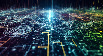 Futuristic digital landscape showcasing a glowing network of interconnected data streams and complex circuitry