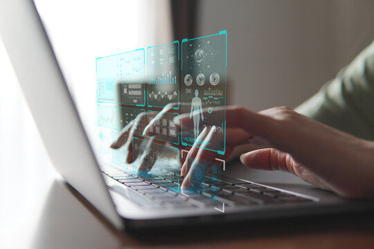 A person interacts with a futuristic holographic display on a laptop, showcasing colorful graphs and data visualization.