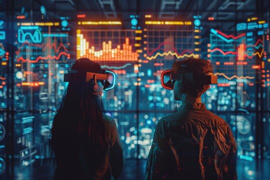Two people in VR headsets analyzing stock market graphs and data in a high-tech room. Futuristic virtual reality stock exchange concept.