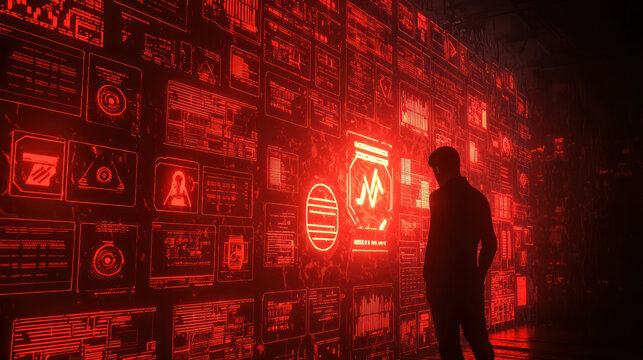 Glowing Futuristic Digital Data Analytics Dashboard with Warning Symbols