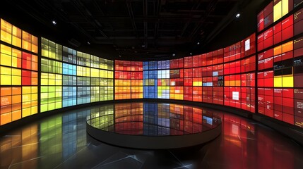 A captivating circular room features a mesmerizing array of vibrant, multicolored screens displaying dynamic data streams, creating a futuristic and immersive experience.