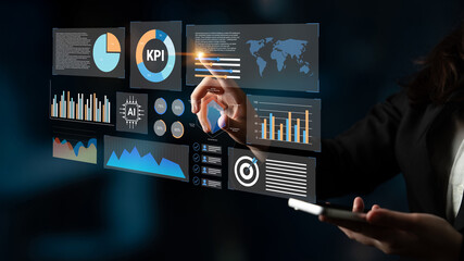 A business professional uses a futuristic touchscreen interface to interact with charts and metrics, emphasizing data analytics and performance insights in a modern workspace. Gantry